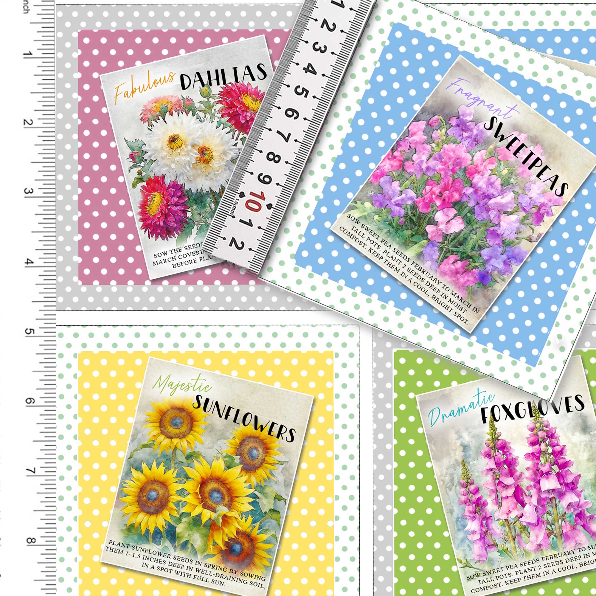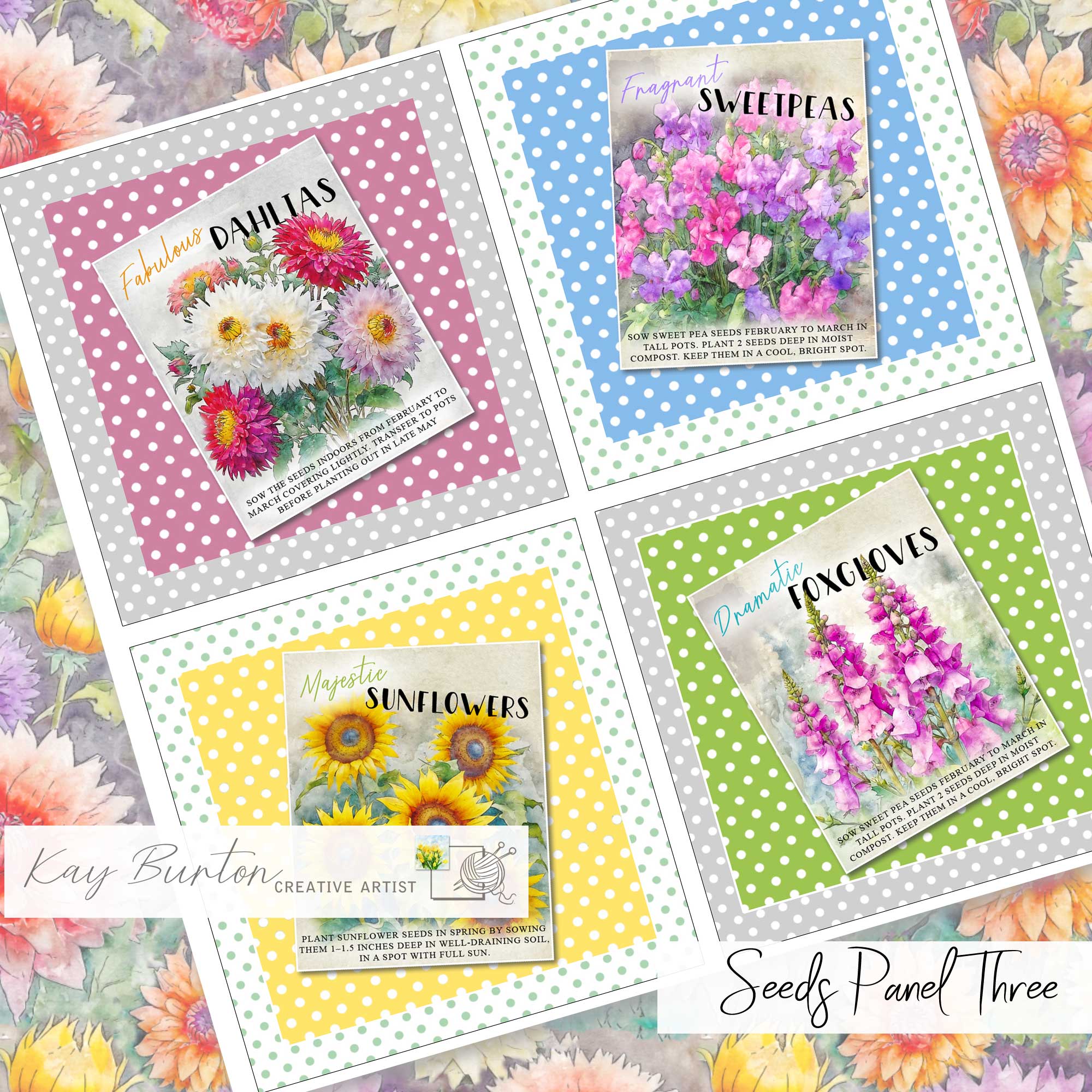 Furthermore, set three includes Sunflowers, Sweetpeas, Dahlias and Foxgloves
